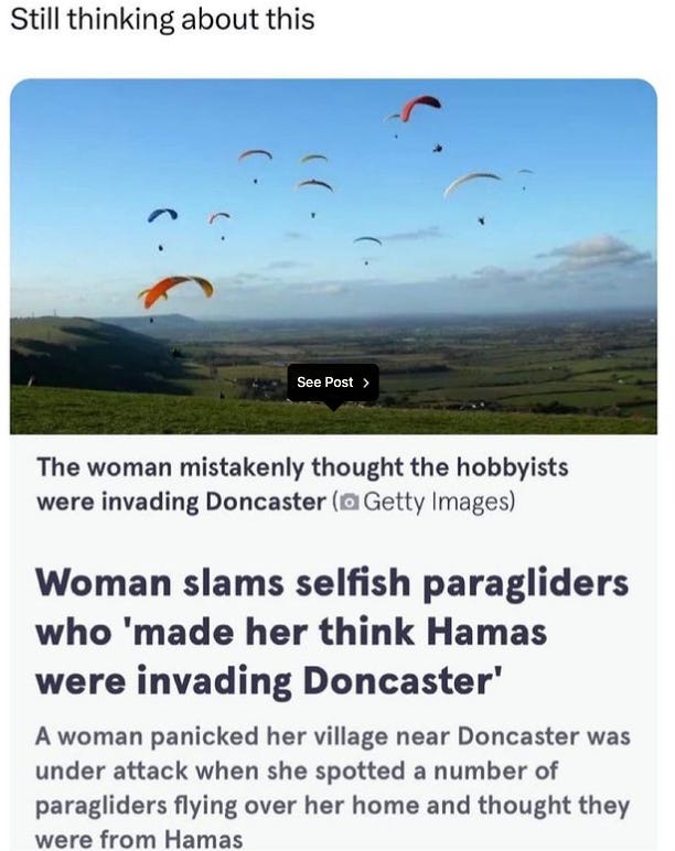 A news headline reposted gained much response, “Woman slams selfish paragliders who 'made her think Hamas was invading Doncaster’—A woman panicked her village near Doncaster was under attack when she spotted a number of paragliders flying over her home and thought they were from Hamas.”